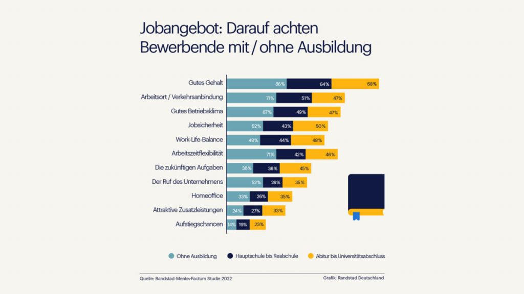 Das Top-Kriterium eines Stellenangebots ist für Bewerber nach wie vor das Gehalt (67%). Eine gute Verkehrsanbindung (51%) und ein gutes Betriebsklima (50%) stehen auf Platz zwei und drei. Danach kommen Jobsicherheit mit 47% und Work-Life-Balance sowie Arbeitszeitflexibilität mit 46%. Der Ruf des Unternehmens ist zweitrangig, aber immer noch für 33% der Bewerbenden ein wichtiges Kriterium. Differenziert man nach dem Bildungshintergrund der Arbeitnehmer, gehen die Prioritäten auseinander.