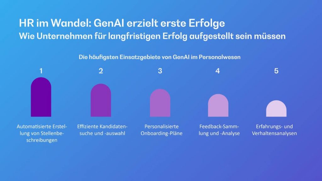 - Erfahrungs- und Verhaltensanalysen zur Verbesserung von HR-Entscheidungen: GenAI wertet das Verhalten und die Erfahrungen der Mitarbeitenden aus, um fundierte und datenbasierte Personalentscheidungen zu treffen.