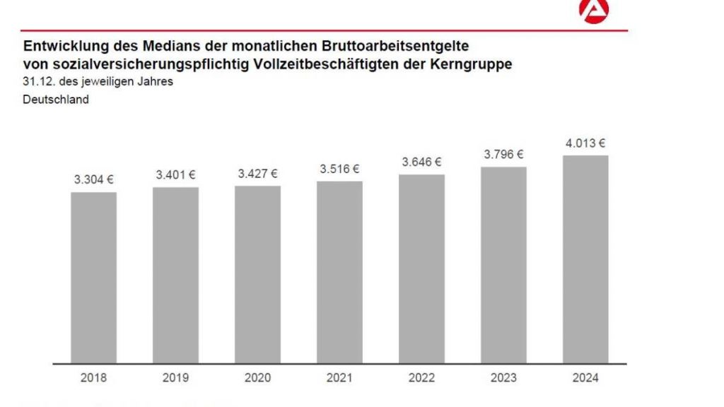 Bild © Bundesagentur für Arbeit (BA) Das Medianentgelt aller sozialversicherungspflichtig Vollzeitbeschäftigten lag im Jahr 2024 bei monatlich 4.013 Euro. Gegenüber dem Jahr 2023 sind die Löhne und Gehälter somit um 218 Euro oder 5,7 Prozent gestiegen. Das deutliche Plus erklärt sich insbesondere mit Entgeltzuwächsen in Folge von höheren Tarifabschlüssen.