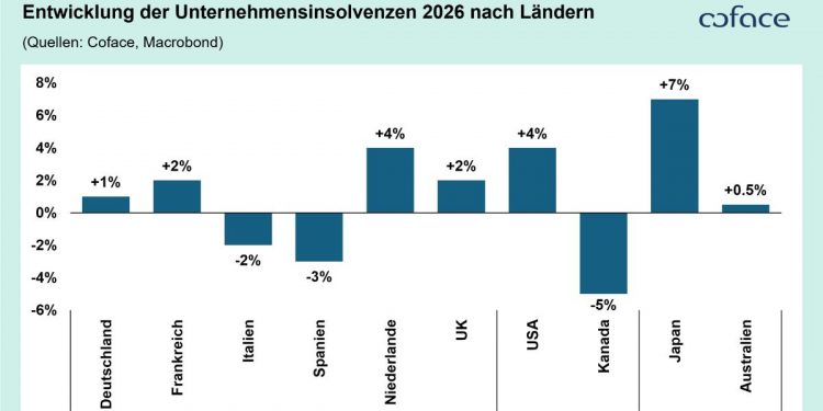 Bild © Coface Deutschland Die Zahl der weltweiten Unternehmensinsolvenzen bleibt 2026 hoch, zeigt jedoch erstmals Anzeichen einer leichten Stabilisierung. Nach deutlichen Anstiegen in den Vorjahren erwartet Coface in den großen Industrienationen einen moderaten Anstieg um 2,8 Prozent, für Deutschland ein Plus von 1 Prozent. Wie nachhaltig diese Stabilisierung ist, hängt jedoch stark vom Zinsumfeld ab: Schon eine Erhöhung um 25 Basispunkte könnte die globale Insolvenzentwicklung wieder kippen.