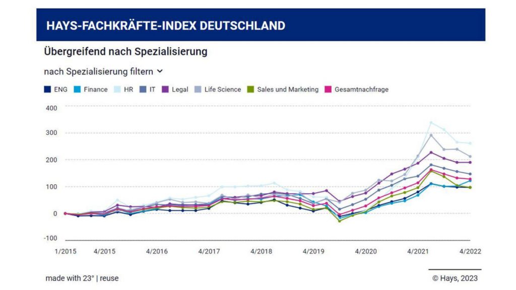Stark abgeschwächt hat sich hingegen die Nachfrage nach Life Science-Spezialisten. Hier verzeichnet der aktuelle Fachkräfte-Index mit -27 Prozentpunkten (auf 212 Prozent) den deutlichsten Rückgang innerhalb der verschiedenen Berufsfelder. Als möglicher Grund kann die abklingende Corona-Pandemie gelten, die der Branche zuvor einen Nachfragepush gegeben hatte.