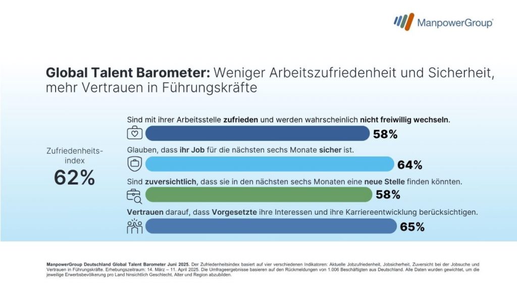 Das ManpowerGroup Global Talent Barometer misst Faktoren wie Well-Being, Zufriedenheit im Job (Job Satisfaction) und Zuversicht im Job (Confidence) von Beschäftigten weltweit in drei Einzelindizes und einem Gesamtindex. Das Global Talent Barometer stützt sich auf unabhängige Umfragen und statistisch signifikante Stichproben, um ein leistungsstarkes Instrument zu schaffen, das ein besseres Verständnis für die Bedürfnisse von Arbeitnehmenden auf der ganzen Welt bietet. Ziel der Studie ist es, die Zukunft der Arbeit durch ein besseres Verständnis der heutigen Schlüsselfaktoren für Arbeitsstimmung zu verbessern. Methodik: Die Umfrageergebnisse stammen von 13.771 Beschäftigten in 19 Ländern (davon Deutschland 1.006) zwischen dem 14. März und dem 11. April 2025. Alle Daten wurden auf die Verteilung der Beschäftigten nach Geschlecht, Alter und Region gewichtet, wobei alle Länder die gleiche Gewichtung erhielten. Befragte Länder: Australien, Kanada, Frankreich, Deutschland, Indien, Israel, Italien, Japan, Malaysia, Mexiko, Niederlande, Norwegen, Polen, Singapur, Spanien, Schweden, Schweiz, Vereinigtes Königreich (UK) und Vereinigte Staaten (US).
