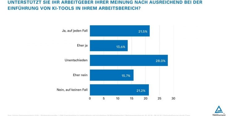 Bild © TÜV Rheinland AG Künstliche Intelligenz (KI) verändert die Arbeitswelt: Sie kann große Datenmengen rasch verarbeiten und viele Routinearbeiten deutlich schneller erledigen als Menschen. Beschäftigte sollen durch die Technologie mehr Freiraum für die Aufgaben gewinnen, die Kreativität, emotionale Intelligenz und Interaktion erfordern. Darüber hinaus müssen sie die Ergebnisse der KI kritisch bewerten und einordnen. Diese Aufgaben können Beschäftigte erfüllen, wenn sie das notwendige Wissen erwerben, um mit KI umzugehen. Allerdings unterstützen Unternehmen ihre Mitarbeitenden bei der Einführung von KI sehr unterschiedlich: 36,9 Prozent fühlen sich dabei von ihrem Arbeitgeber nicht oder eher nicht unterstützt. Dem stehen 35,1 Prozent der Befragten gegenüber, die sich eher gut oder gut unterstützt fühlen, wie eine repräsentative Civey-Umfrage im Auftrag von TÜV Rheinland zeigt.