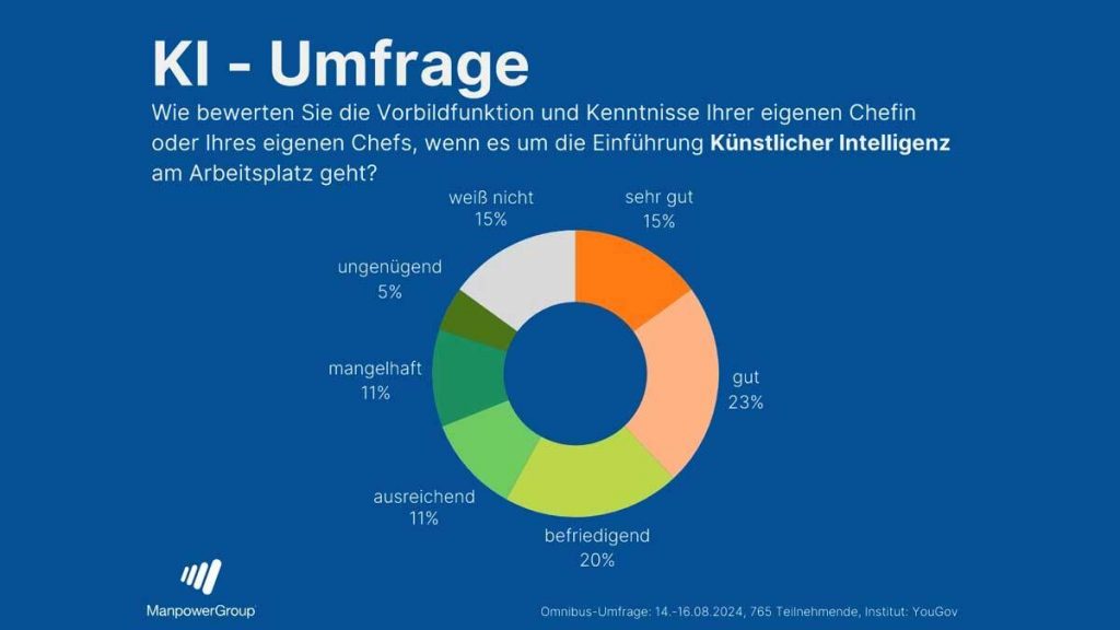 Auch regional lassen die Umfrageergebnisse Unterschiede erkennen: In Berlin und Hessen erhalten die Vorgesetzten die besten Noten. 37 Prozent der Berliner und 23 Prozent der hessischen Angestellten vergeben die Schulnote „sehr gut“ für ihre Chefs in Bezug auf KI-Kompetenzen. Besonders schlecht schneiden Führungskräfte in Mecklenburg-Vorpommern und Sachsen-Anhalt ab, wo 45 beziehungsweise 32 Prozent der Befragten die Kenntnisse ihrer Chefs als „mangelhaft“ oder „ungenügend“ bezeichnen.
