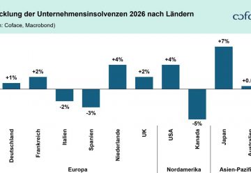Die Zahl der weltweiten Unternehmensinsolvenzen bleibt 2026 hoch, zeigt jedoch erstmals Anzeichen einer leichten Stabilisierung. Nach deutlichen Anstiegen in den Vorjahren erwartet Coface in den großen Industrienationen einen moderaten Anstieg um 2,8 Prozent, für Deutschland ein Plus von 1 Prozent. Wie nachhaltig diese Stabilisierung ist, hängt jedoch stark vom Zinsumfeld ab: Schon eine Erhöhung um 25 Basispunkte könnte die globale ...