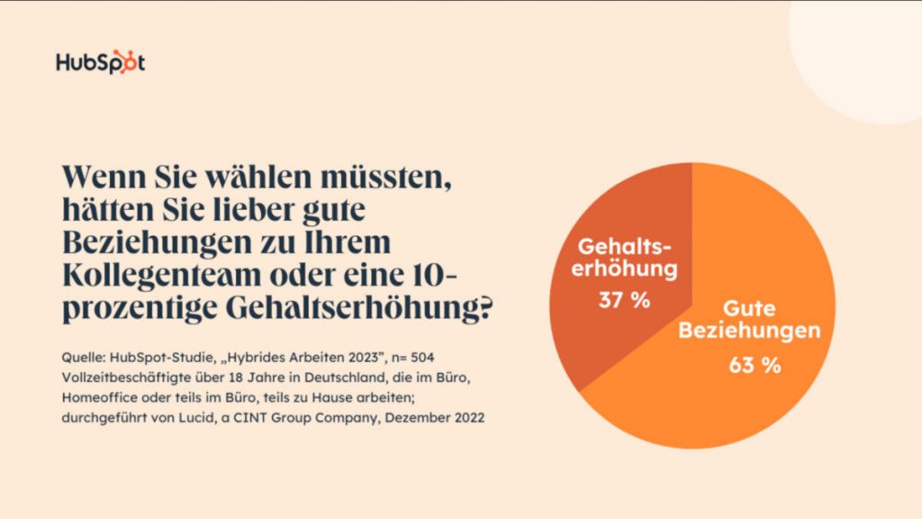 63 Prozent der Angestellten in Deutschland hätten lieber bessere Beziehungen zu ihrer Kollegenschaft als eine Gehaltserhöhung um zehn Prozent. Das ist ein Ergebnis der Studie „Hybrides Arbeiten 2023“ des CRM-Plattform-Anbieters HubSpot. Für die Erhebung wurden insgesamt 5.058 Arbeitnehmende in zehn Märkten zur hybriden Arbeitswelt und ihren Herausforderungen befragt. In Deutschland nahmen 504 Angestellte an der Umfrage teil.