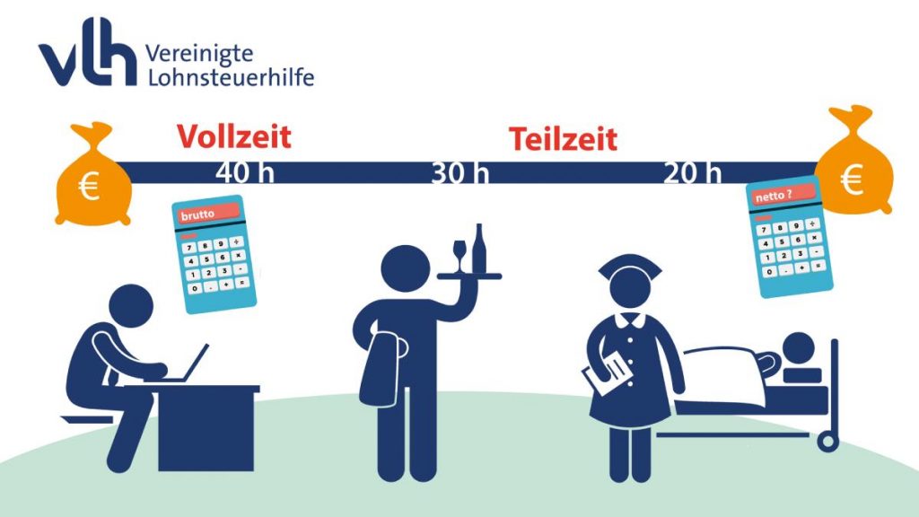 Bild © Vereinigte Lohnsteuerhilfe e.V. – VLH Rund 13 Millionen Beschäftigte in Deutschland arbeiten in Teilzeit. Manche davon aus freien Stücken, weil sie mehr Freizeit möchten. Andere wiederum, weil es beispielsweise wegen der familiären Situation nicht anders geht. Eine Teilzeitkraft verdient logischerweise weniger Geld als eine Vollzeitkraft in vergleichbarer Position. Was bleibt Netto vom Brutto übrig, und mit welchem Teilzeitmodell fährt man am besten? Der Lohnsteuerhilfeverein Vereinigte Lohnsteuerhilfe e. V. (VLH) mit Antworten und Rechenbeispielen.