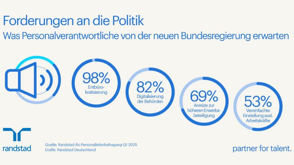 Bild © Randstad Deutschland GmbH & Co. KG In Berlin steht ein Regierungswechsel bevor und Personalverantwortliche in deutschen Unternehmen wünschen sich vor allem Entbürokratisierung und Digitalisierung der Behörden. Anreize zur höheren Erwerbsbeteiligung rangieren ebenfalls oben auf der Liste der Prioritäten für die Wirtschaft.